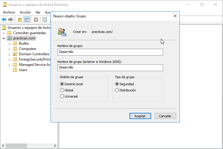 Hacemos clic en la raíz de nuestro dominio, en mi caso el dominio Practicas y haciendo clic derecho elegimos la opción “nuevo” y despues la opción “grupo”. Una vez que se nos abra la ventana para crear el grupo tendremos que asignarle un nombre asi como elegir el ambito y el tipo de grupo que será. Ej: