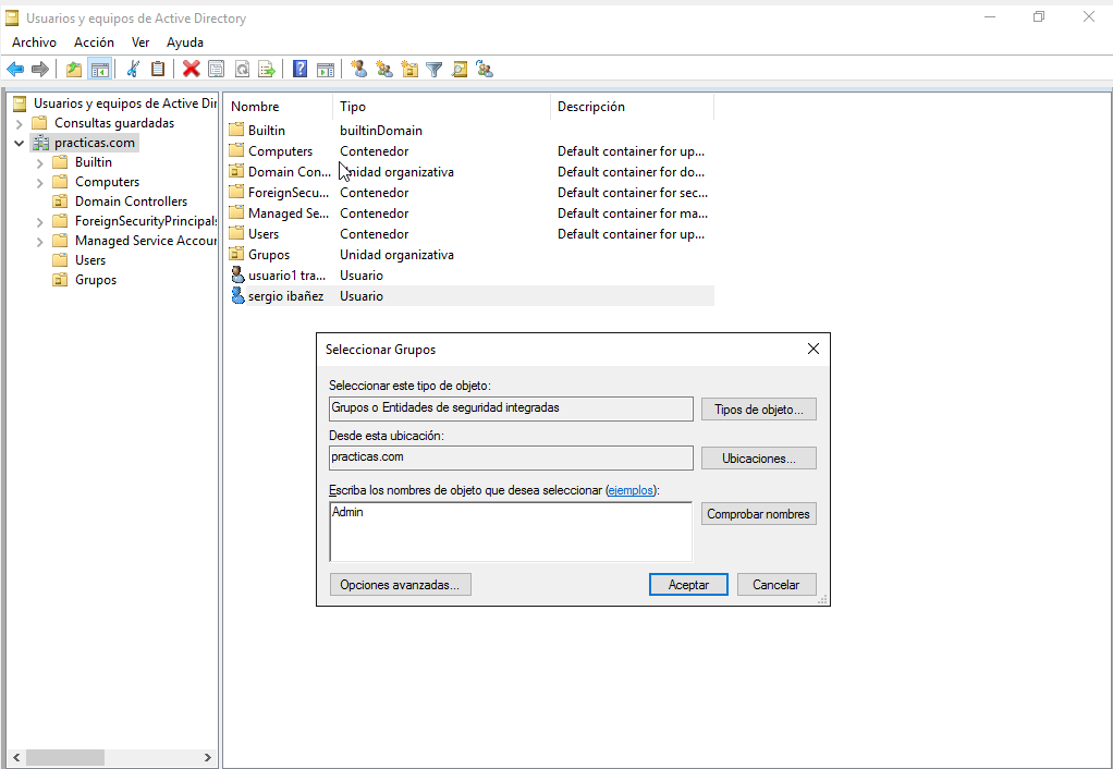 Después de agregar tendremos que indicar a que grupo se agregara el usuario, por ejemplo si mi dominio se llama Pruebas y en la empresa sera uno de los administradores, seria Admin (para ello debe existir previamente el grupo que especifiquemos sino obviamente no podremos agregar ningun usuario). Ej: