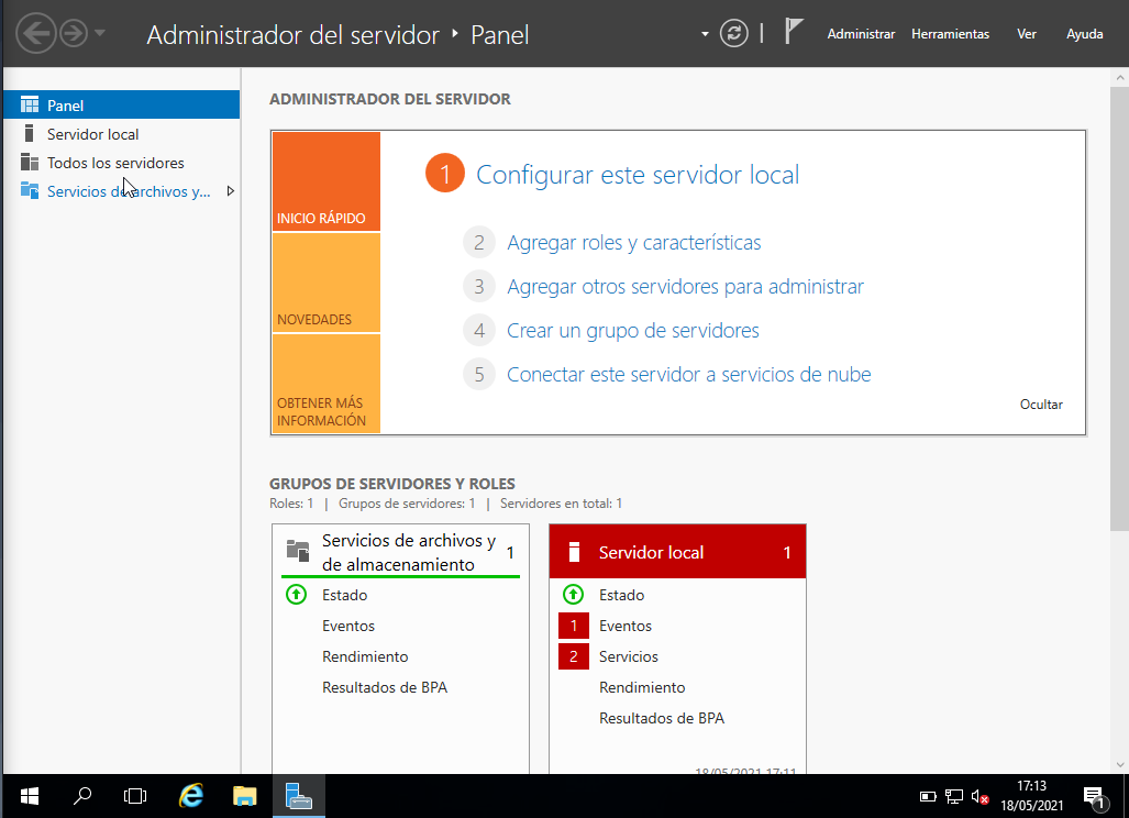 El sistema se reiniciará para guardar la configuración y veremos en el panel del Administrador del Servidor que ya contamos con las opciones relacionadas al Directorio Activo.