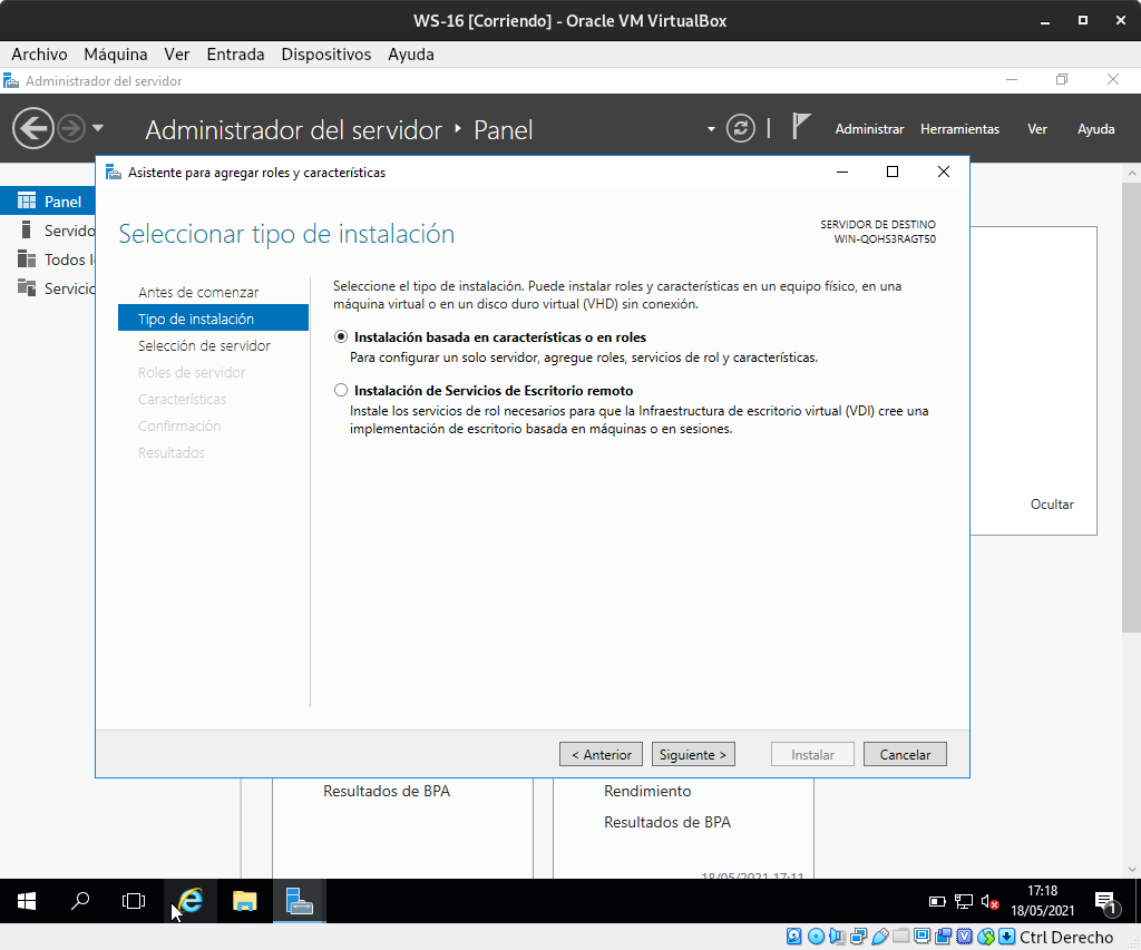 - En la ventana inicial hacemos clic en siguiente y elegimos la opción de la Instalación basada en roles.