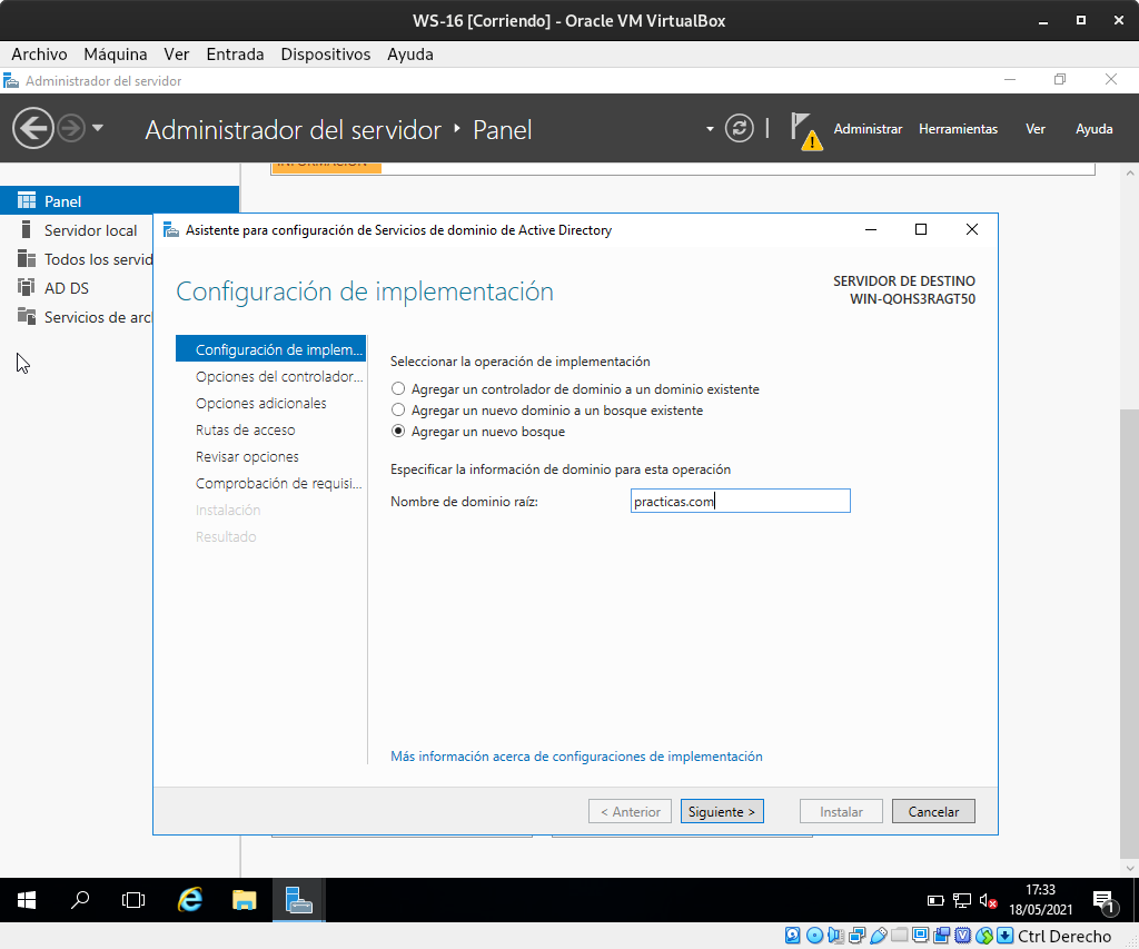 - Hacemos clic en siguiente y elegimos el servidor donde queremos instalar nuestro rol de AD DS.